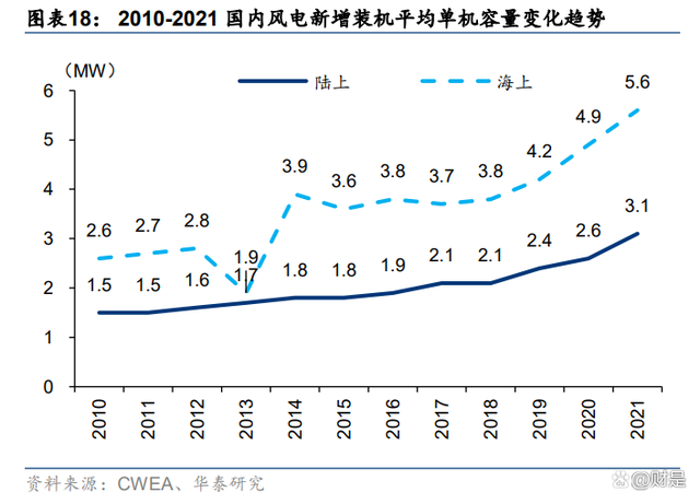 风机大型化可减少单位容量材料用量,进而降低单位容量的风机造价。据 NREL 最新公布的风电成本报告,通过风机大型化、更高效的管理策略等因素可提高风电场 57%的发电量,贡献 20 美元/MWh 的 LCOE 降幅。此外,风机大型化使得相同规模的风电场需要安装的风机数量减少,降低单位容量的材料耗量,叠加风机本身制造效率提升,可降低约 31%的资本支出,贡献 8 美元/MWh 的 LCOE 降幅。
