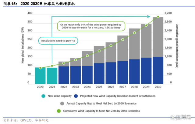 从度电成本看:当前陆上风电已进入平价时代,风电已有性价比。据国际可再生能源署 IRENA 发布的《2021 年可再生能源发电成本》显示,目前全球陆上风电度电成本已降至 0.033 美元/千瓦时,同比 2020 年下降 15%;海上风电度电成本降至 0.075 美元/千瓦时,降幅 13%。当前时点看陆上风电已具备性价比,成本低于水电(0.048 美元/千瓦时)和光伏(0.048 美元/千瓦时)。从全球装机看:据 GWEC 预测,2020-2030 年全球风电年平均新增装机应达 180GW,以加快能源结构转型,完成减少碳排放、将全球升温控制在 2℃以内的目标;其中 2022- 2026 年全球风电新增装机约 557GW,年均复合增速为 6.6%;2030 年新增风电装机规模应较 2021 年增长约四倍。