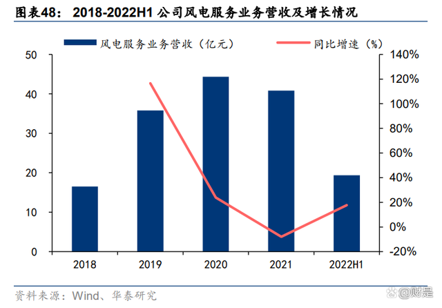 在风电累计容量增长驱动下,风电后服务市场空间较大。目前,我国风电累计装机已达 3.28 亿千瓦,在役机组超 15.5 万台;据金风科技在 2021 年“第八届中国风电后市场交流合作大会”上分享,“十四五”期间,风电机组出质保规模在 2025 年将达到 256GW,并实现 16%的 CAGR 增长。随着风电后服务业务增长,公司风电服务盈利有望进一步提升。2022H1,公司风电后服务实现营收 10.4 亿元,同比增长 38.27%,占风电服务总收入比例提升至 53.5%,带动该板块毛利率提升至 19.81%。