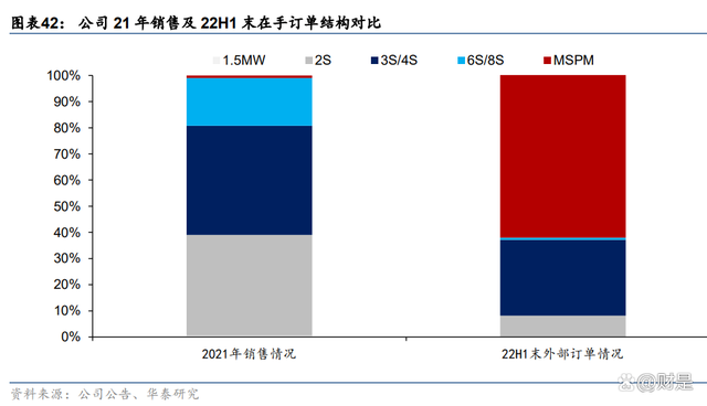 订单结构紧随行业大型化趋势,进一步验证公司技术和品牌实力。切入半直驱技术路线后,公司 2021 年半直驱机组销售 108.50MW,并取得 4.8GW 容量订单,占 2021 年全年外部订单(与外部第三方签署供货协议)约 29%。凭借扎实的技术,截至 2021 年公司已连续 11 年保持中国市场份额第一,连续 7 年保持全球市场份额前三。2022 年中,公司在手订单容量为 24.13GW,创历年新高,同比增长 47.70%、环比增长 38.39%。