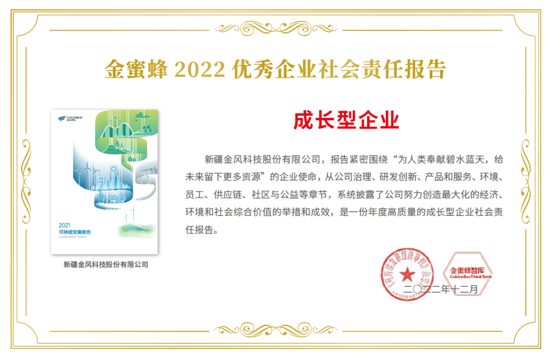 12月2日,第十五届中国企业社会责任报告国际研讨会暨“金蜜蜂2022优秀企业社会责任报告”发布典礼在线上举办,《金风科技2021可持续发展报告》(下称“《报告》”)荣登“金蜜蜂2022优秀企业社会责任报告”榜单,获得“成长型企业”荣誉,这是公司连续第二年登上榜单并获此殊荣。