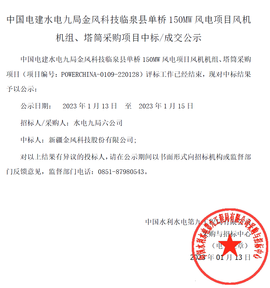 1月13日,中国电建水电九局金风科技临泉县单桥150MW风电项目风机机组、塔筒采购项目入围公示,金风科技中标。