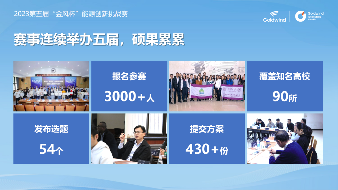 “金风杯”能源创新挑战赛创立于2018年,由金风科技与清华大学电机系联合中国可再生能源学会风能专业委员会、中国农业机械工业协会风力机械分会两大行业协会共同主办。赛事以“培养广大高校学生对可再生能源行业的兴趣认知和专业素养,促进更多青年投身于推动全球能源转型的事业中”为目标,旨在以校、企、社会组织协同模式,推动新能源领域产学研融合发展。