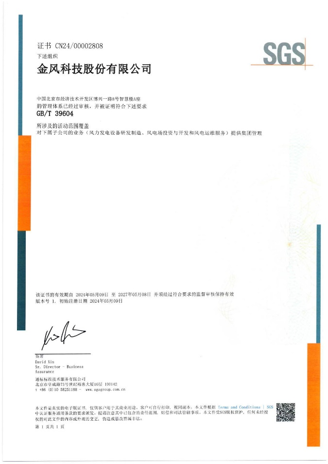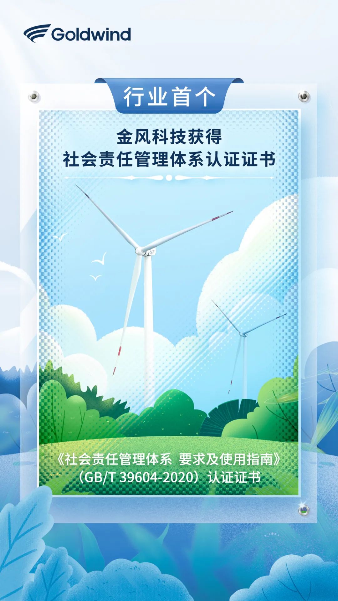 近日,金风科技获得社会责任管理体系国家标准《社会责任管理体系要求及使用指南》(GB/T 39604-2020)认证证书,成为风电行业第一家获得此认证证书的企业。该证书由通标标准技术服务公司(SGS)颁发。