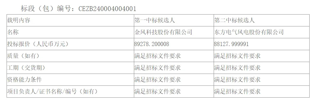 公告显示,金风科技成功中标,公示中标价格为89278.20万元。