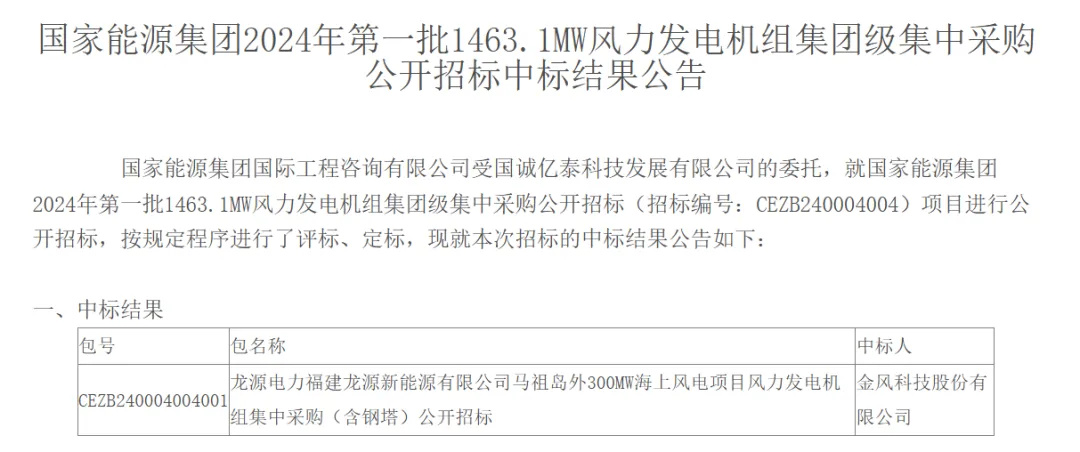 近日,国家能源集团2024年第一批1463.1MW风力发电机组集团级集中采购标段一:龙源电力福建龙源新能源有限公司马祖岛外300MW海上风电项目风力发电机组集中采购(含钢塔)项目公开招标中标结果公布。