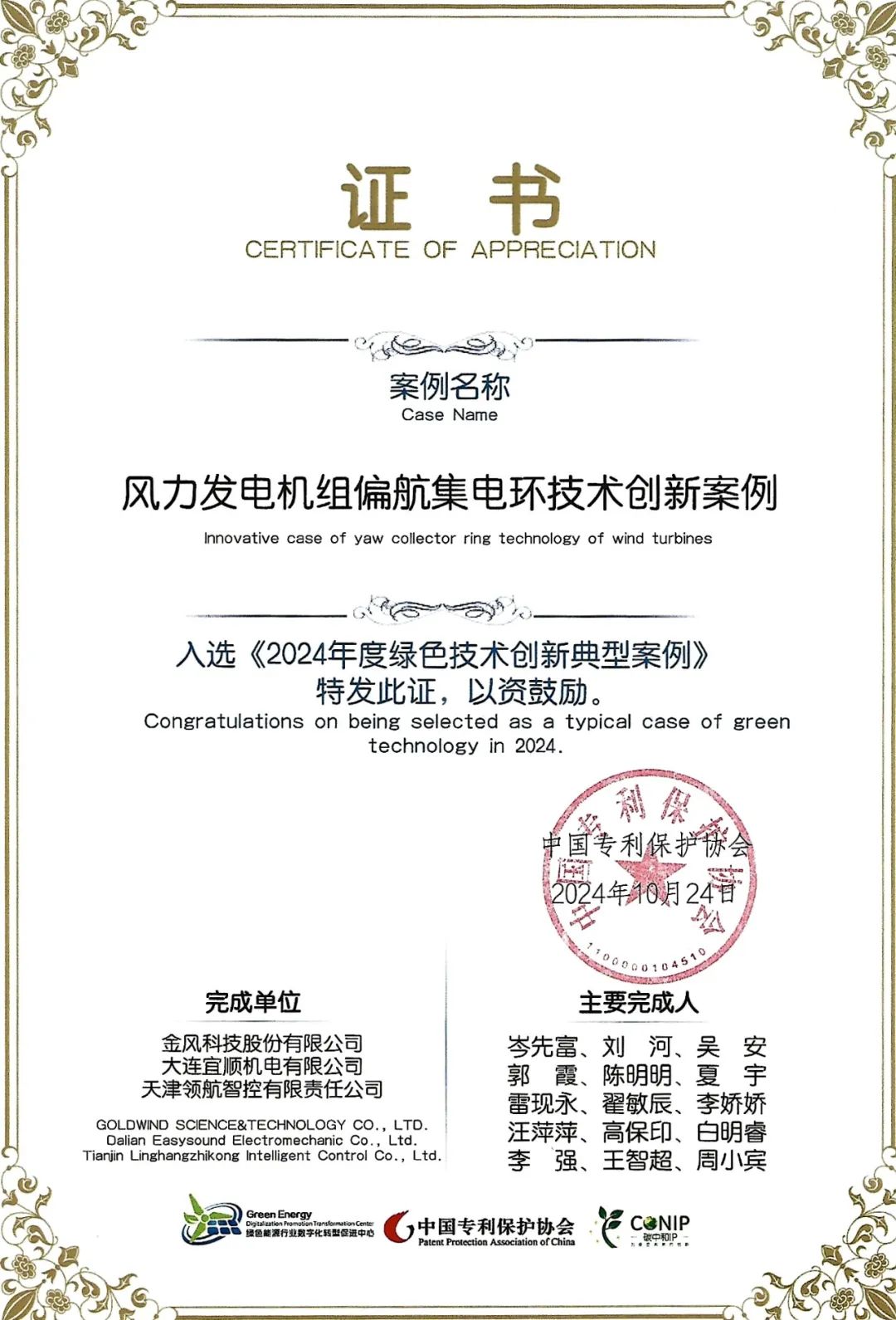 截至目前,金风偏航集电环技术累计获得授权专利36件,其中发明专利15件。2024年,该技术的产业化运用入选国家知识产权局发布的专利产业化十大典型案例,以及中国专利保护协会发布的《2024年度绿色技术创新典型案例》。此外,由金风科技主导的“风力发电机组偏航集电环技术规范”已在2023年通过国家能源局立项审批,今年已启动标准编制发布工作。
