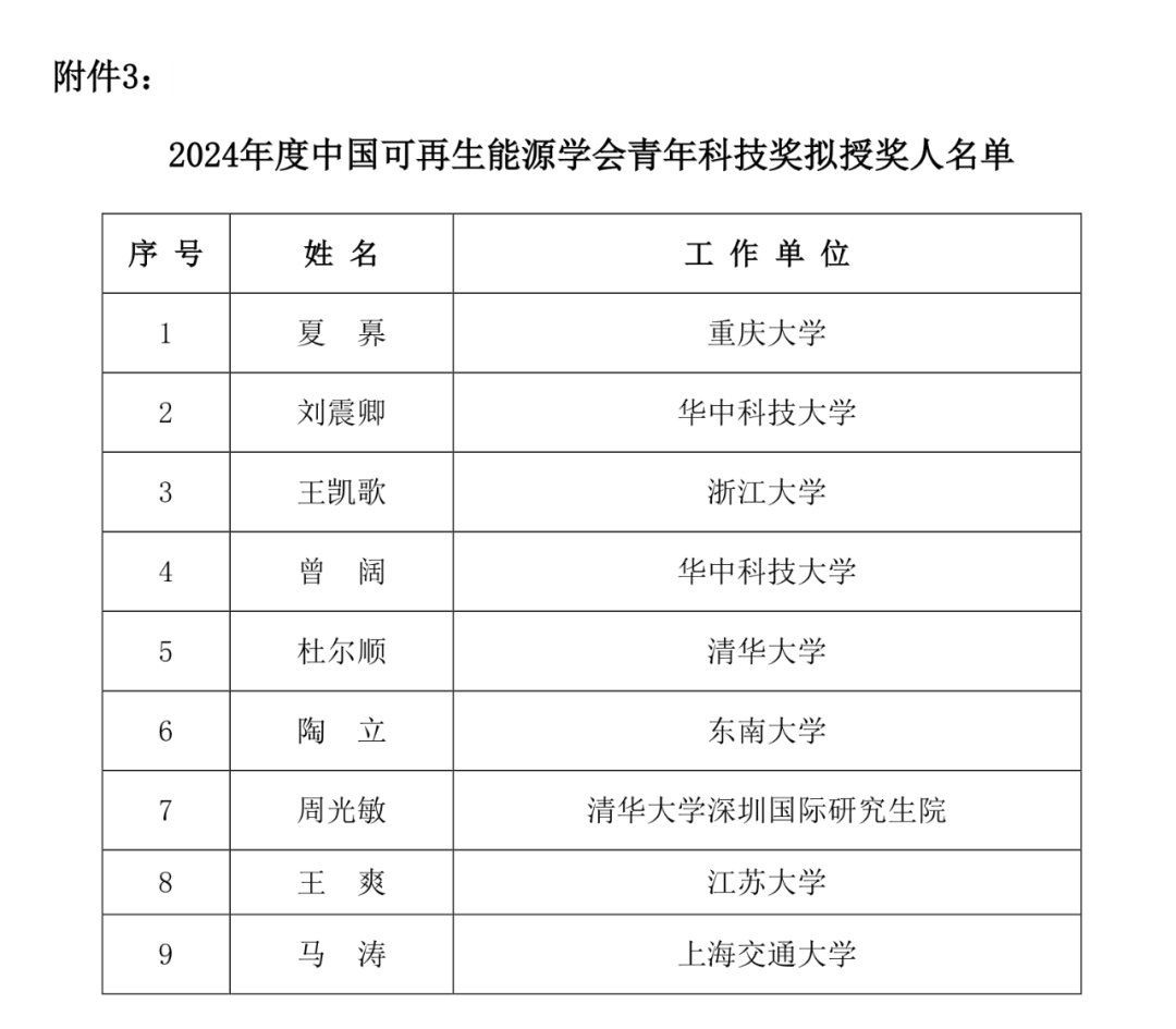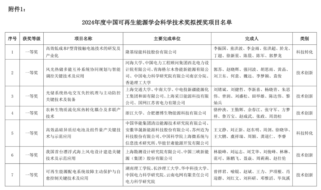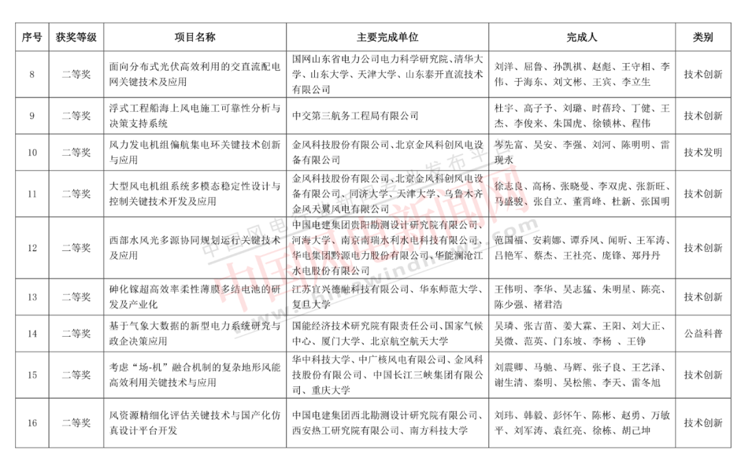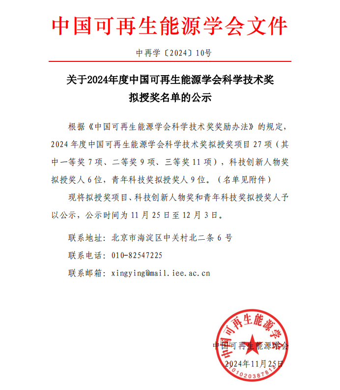 11月25日,中国可再生能源学会公布2024年度中国可再生能源学会科学技术奖,其中涉及风电项目8个。分别是: