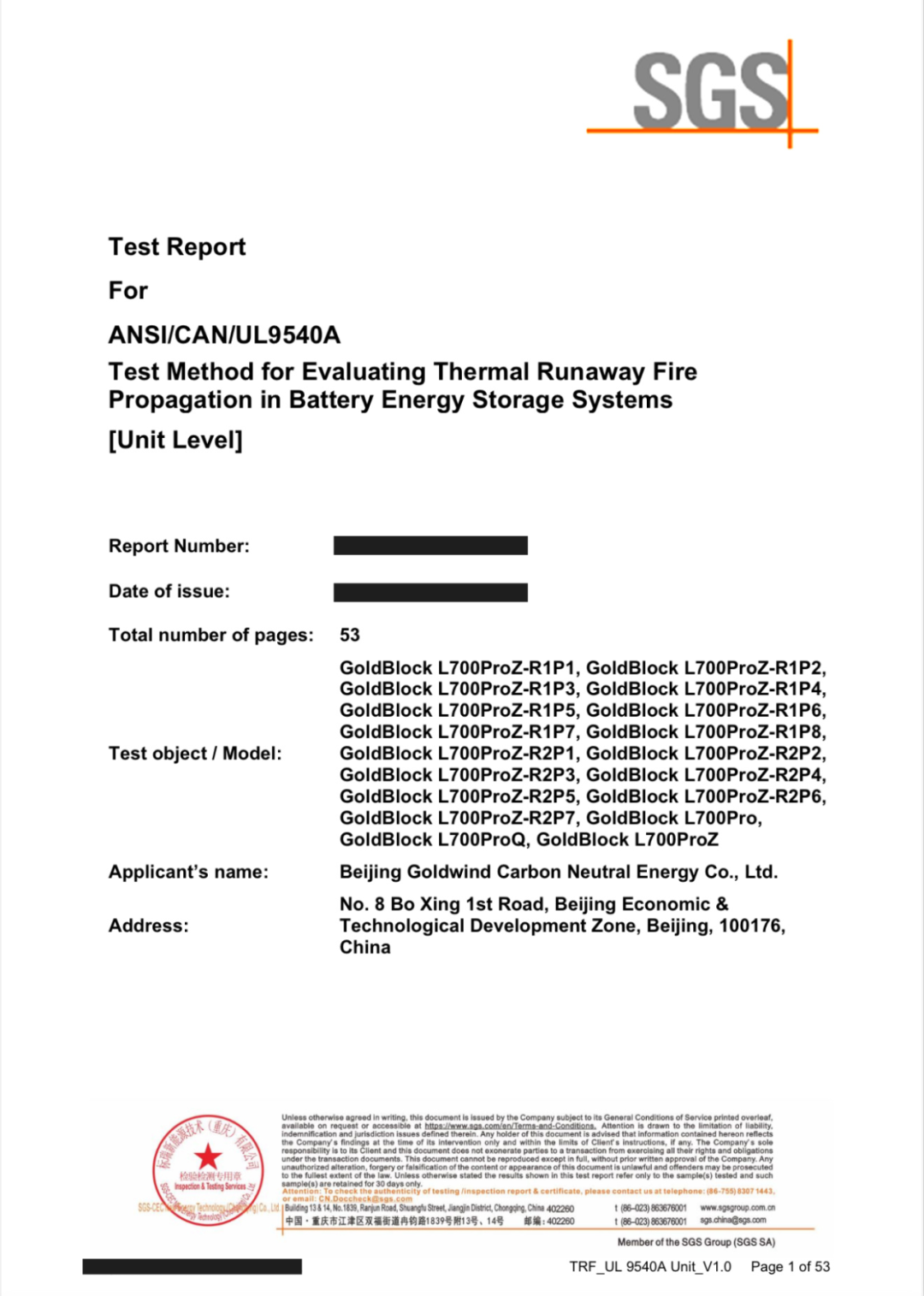 UL 9540A测试模拟针刺、过充、高温等电芯热失控扩散的极端场景。在测试过程中,GoldBlock L700储能系统采用更严苛的排布方式,成功将热失控影响控制在模组级别,验证了单颗电芯故障不会引发Pack级连锁反应,充分证明了产品安全性。