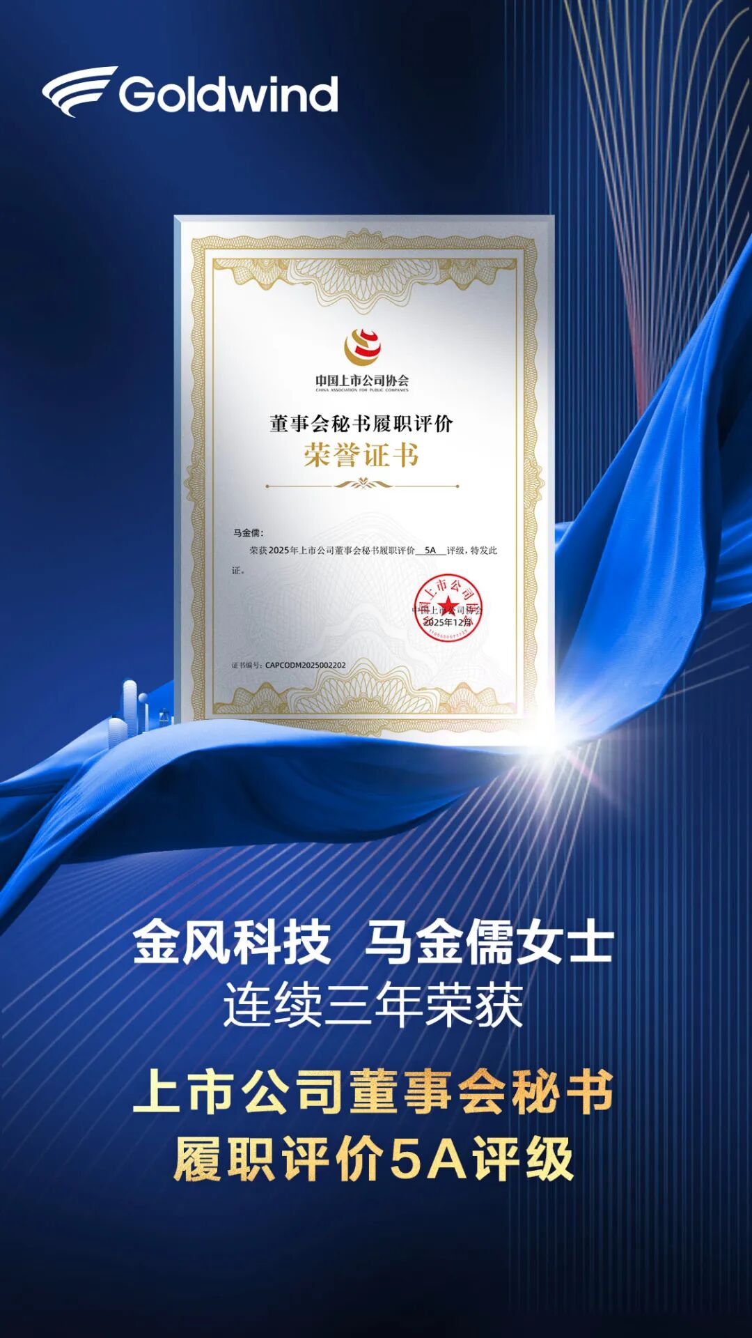 近日, 中国上市公司协会 发布了“2025上市公司董事会秘书履职评价”结果。 金风科技 副总裁、董事会秘书兼公司秘书马金儒女士连续第3年荣获5A最高评级。