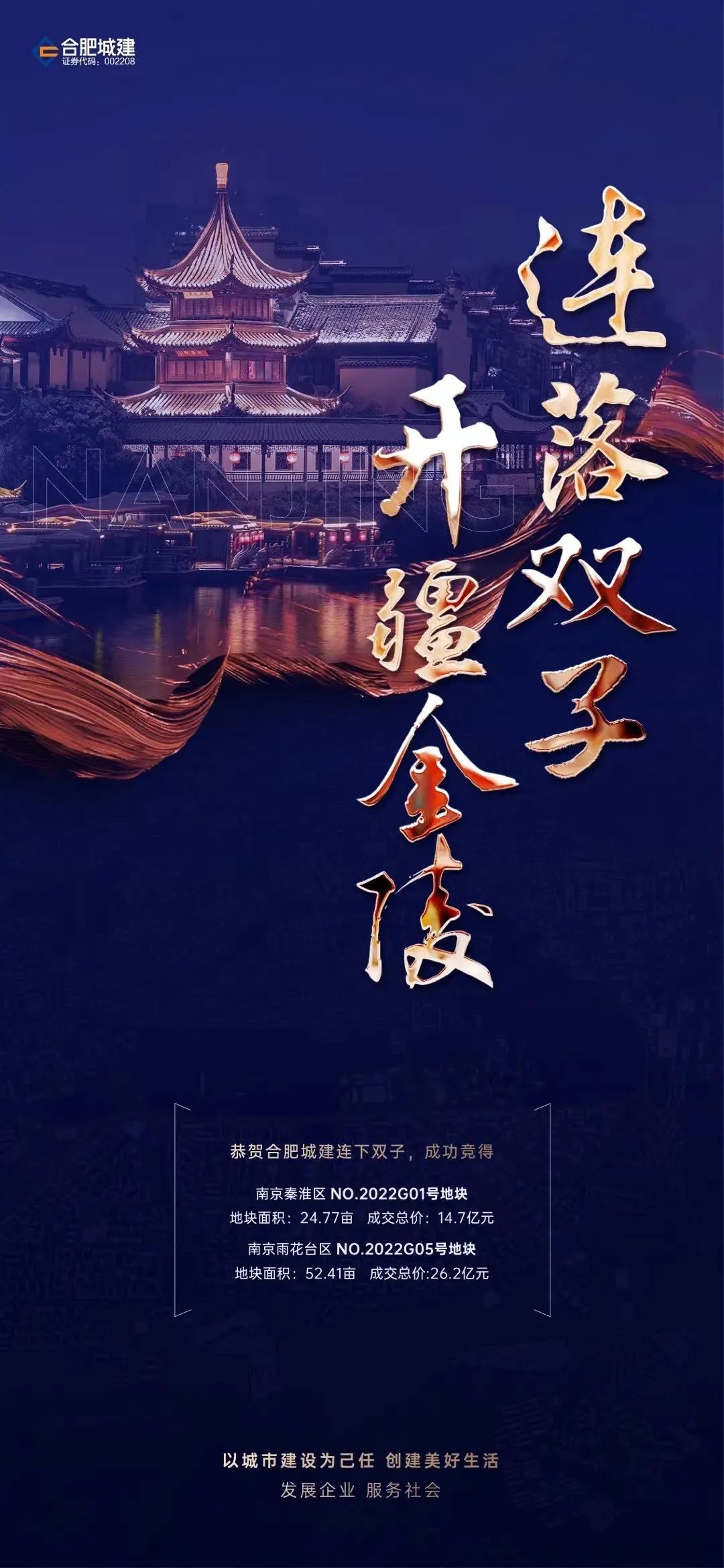 2022年4月22日,合肥城建分别以成交总价14.7亿元、26.2亿元的价格,成功竞得南京NO.2022G01号、NO.2022G05号地块。