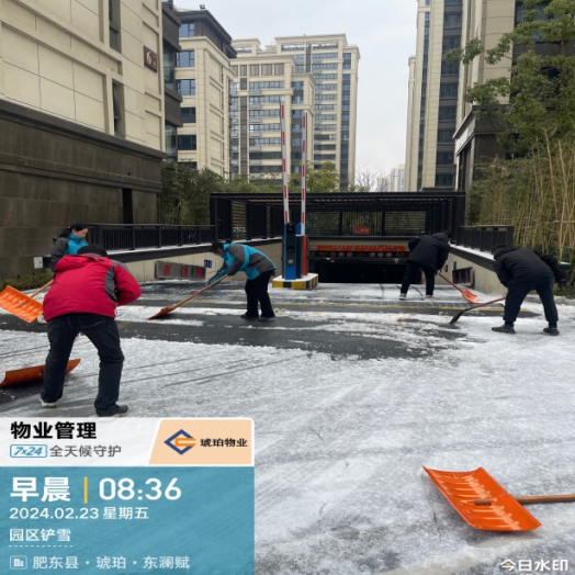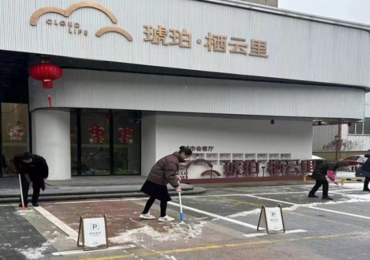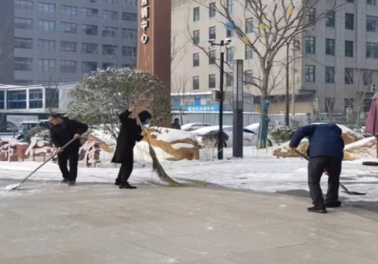 在各项目和物业管理小区扫雪除冰现场,认真落实“门前三包”责任,积极配合市政、城管等部门开展扫雪除冰行动,自发组织干部职工对售楼部、小区内部道路等公共区域雪冰进行清除,并对施工现场等区域进行安全巡查。大家不畏严寒、不减热情,以饱满的精神状态和昂扬的精神风貌参与到行动中,为广大人民群众和业主“开辟”出一条无积雪的“暖心路”。