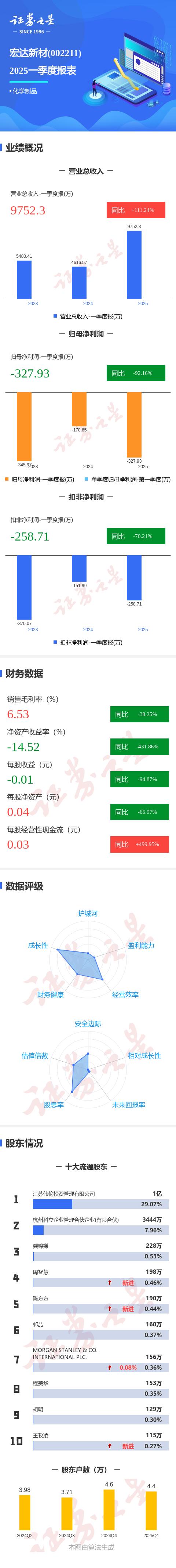 宏达新材2025年一季报显示,公司主营收入9752.31万元,同比上升111.25%;归母净利润-327.94万元,同比下降92.16%;扣非净利润-258.72万元,同比下降70.22%;负债率94.71%,财务费用-40.28万元,毛利率6.53%。