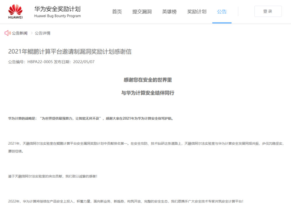 近日,天融信科技集团收到华为鲲鹏计算平台漏洞奖励计划感谢信,“2021年,天融信阿尔法实验室在鲲鹏计算平台安全漏洞奖励计划中贡献排名第一。”此次是继2020年后,再次以高分位居榜首!