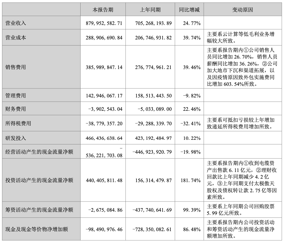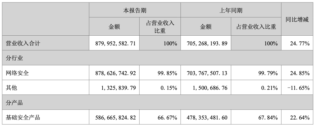 2022年8月20日,天融信发布的《2022年半年度报告》显示:营收 8.8 亿,去年同期 7.05 亿;净利润-2.06 亿,去年同期 1.82 亿。