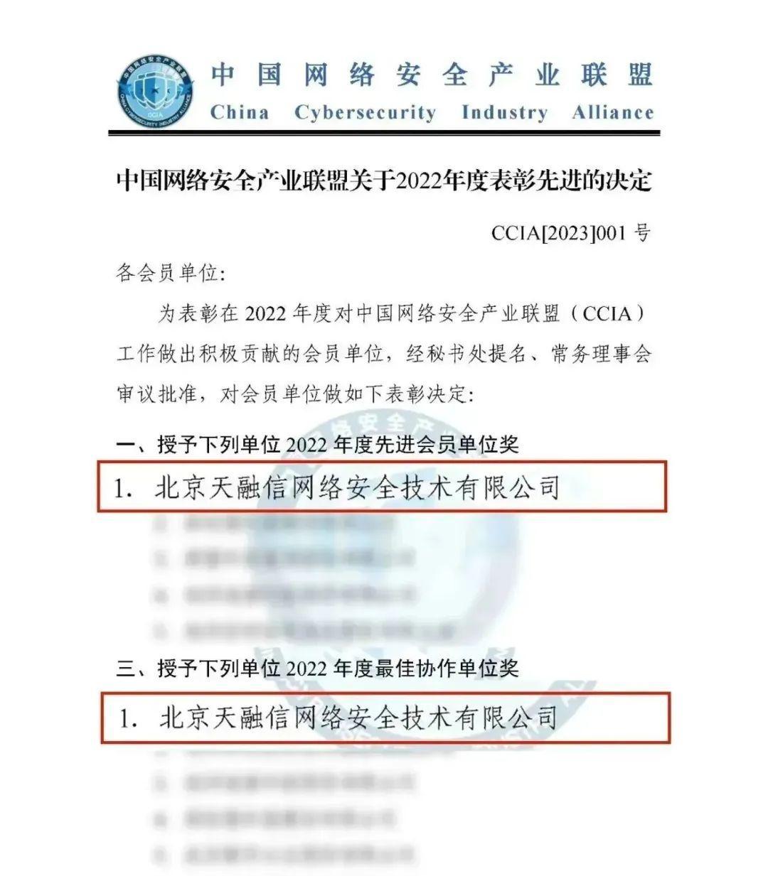 近日,中国网络安全产业联盟(以下简称“CCIA”)发布关于2022年度表彰先进的决定。凭借在联盟中的积极贡献,天融信科技集团以最高分荣获2022年度“先进会员单位奖”、“最佳协作单位奖”双料大奖。