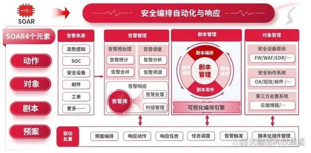 ●协同化提升实战能力。SOAR在现有以数据为中心的安全运营框架基础之上增加了一个以流程为中心的编排层,进一步完善丰富了安全运营的体系,将人、流程、技术和工具整合,提升了安全运营的实战化水平。