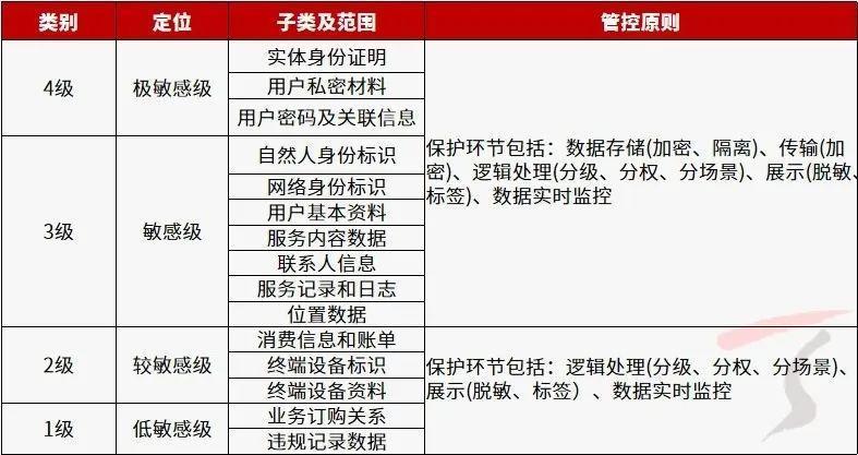 目前运营商业务运营体系中包含敏感信息的系统主要有计费系统、营业系统和经营分析系统,针对涉及的用户信息(如姓名、身份证号码、住址等)基本已经实现敏感信息生产治理、敏感信息稽核、涉敏日志上报等管控。然而,相关数据平台和业务应用中保留了业务运营的敏感信息数据,服务内容数据、服务记录和日志位置数据等还需要进一步进行安全改造。为了做好数据平台及其业务应用的敏感数据管控,需要对涉及的全量敏感信息进行分责、分级、分类管控,总体上可以分为如下所示的4个级别。