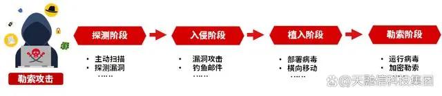 企业一旦感染勒索病毒,不仅面临因信息系统数据被加密而导致业务中断、经济损失的风险,还可能因数据泄露而被监管机构处罚。因此,构建有效的勒索防御体系,已成为众多企业的迫切需求。聚焦勒索病毒攻击链,典型的攻击流程包括“探测、入侵、植入、加密”四个阶段: