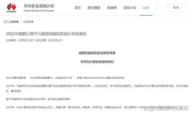 近日,天融信科技集团收到2022年华为鲲鹏计算平台邀请制漏洞奖励计划致谢信。此次是继2020、2021年后,天融信再次以高分位居榜首!