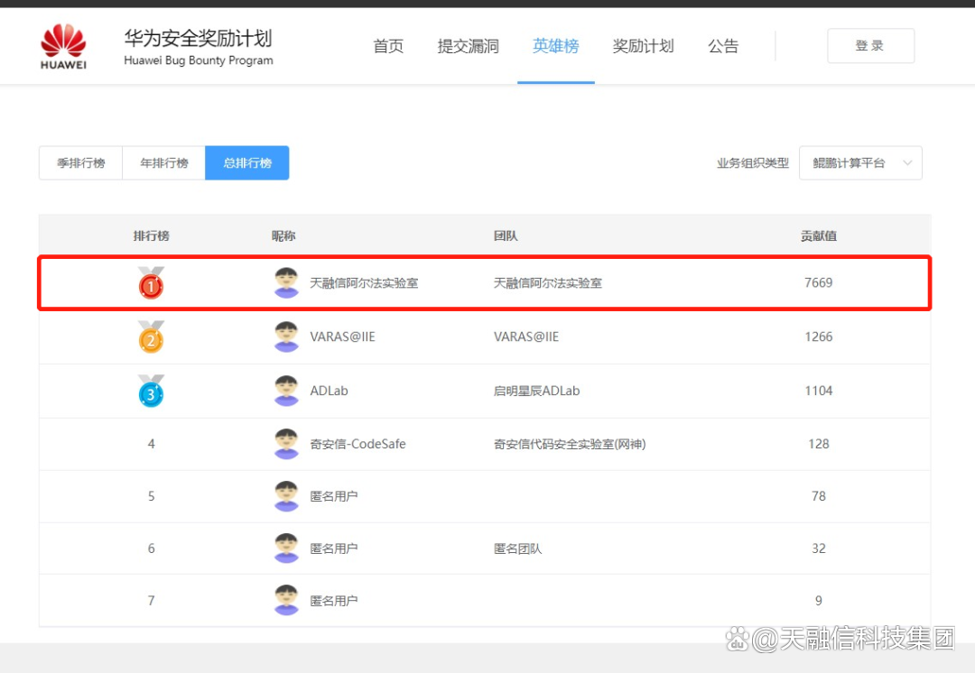 2022年,天融信阿尔法实验室在鲲鹏计算平台安全漏洞奖励计划中贡献排名第一。在安全攻防、技术钻研这条道路上,天融信与华为计算安全发展同频共振,步伐沉稳坚实,屡创佳绩。鉴于天融信阿尔法实验室的突出贡献,我们致以诚挚的感谢!