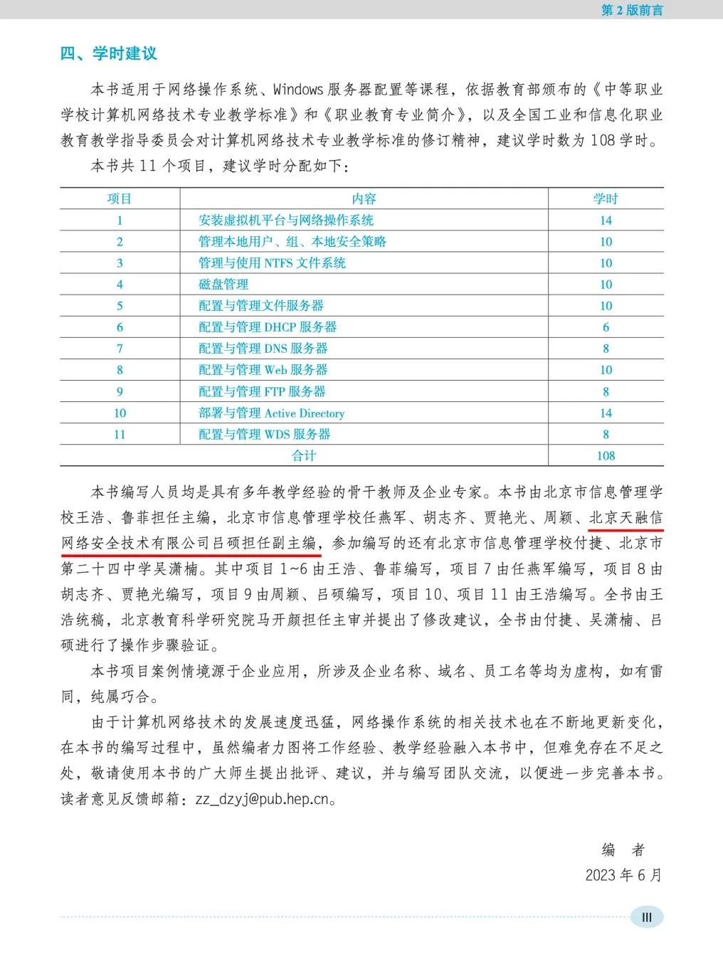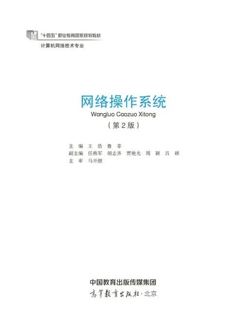 《网络操作系统(第2版)》由北京市信息管理学校王浩老师担任主编,由天融信科技集团技术专家吕硕担任副主编。教材编写期间,天融信科技集团技术专家吕硕与学校多次开展研讨,确定内容技术选型、知识点范围等相关内容,并为教材提供网络实施典型案例作为参考,历经多次审核与校对,最终在高等教育出版社出版发行。