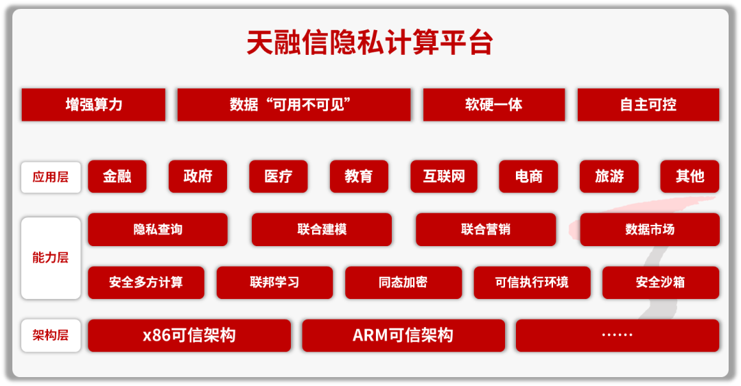 平台分为应用层、能力层和架构层,其中能力层作为平台的大脑,保障数据计算的机密性、安全性和可扩展性,包含可信执行环境、联邦学习、多方安全计算、安全沙箱等多种技术、环境及框架。
