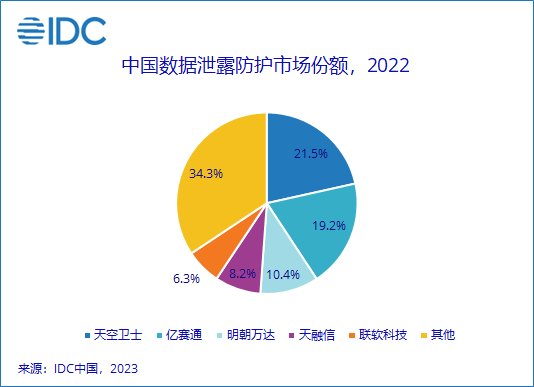 近日,IDC发布了《中国数据泄露防护市场份额,2022》报告,数据显示,中国数据泄露防护市场在2022年实现了4.8%的同比增长,规模达到1.31亿美元。其中,专业数据安全技术提供商占据主要地位,例如天空卫士、亿赛通、明朝万达等。