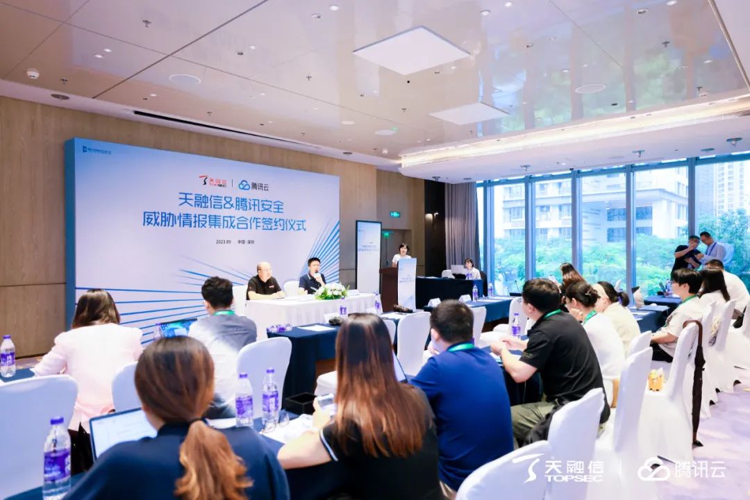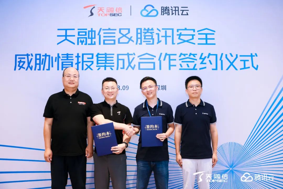 9月7-8日,以“智变加速,产业焕新”为主题的2023年腾讯全球数字生态大会在深圳国际会展中心隆重举行。大会期间,天融信科技集团与腾讯安全达成威胁情报集成合作协议,正式将腾讯安全威胁情报能力以SDK的方式集成到天融信下一代防火墙产品中,双方优势互补,共同提升企业客户边界安全防护能力。天融信科技集团高级副总裁杨斌、副总裁刘斯宇,腾讯安全副总裁方斌、产品副总经理洪春华出席签约仪式。