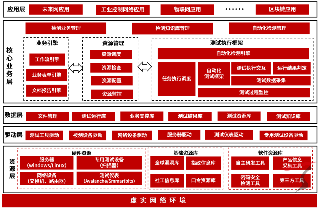 应用层:构建产品自动检测体系,可对未来网、工业控制网络、物联网和区块链应用等不同类型网络提供产品自动检测支持。
