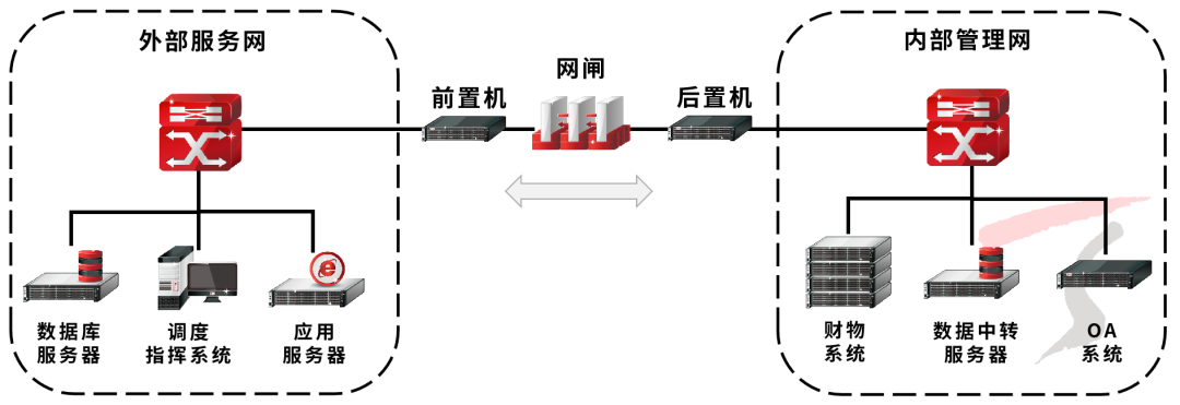 在外部服务网和内部管理网之间部署天融信安全数据交换系统(前后置)+网闸,阻断基于TCP/IP协议的各种攻击。前后置服务器将应用数据剥离出来,用专用的协议封装,通过网闸将数据摆渡到对端,完成不同安全等级网络之间的数据安全交换,保障城市轨道交通客户的业务系统、门户网站等平稳运行。