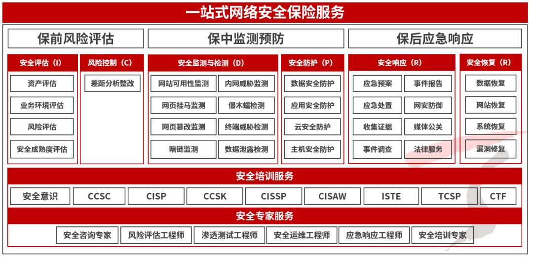 网络安全技术是网络安全保险发展的前提,天融信可面向各行业提供网络安全保险全生命周期服务:一是承保前期阶段,提供安全评估和风险控制功能,评估安全风险和安全能力;二是承保过程中,提供监测检测和安全防护功能,及时发现风险变动,针对威胁实施相应防护措施;三是承保后期阶段,提供安全响应和安全恢复功能,及时采用应急响应服务处置事件,恢复数据,修复漏洞。