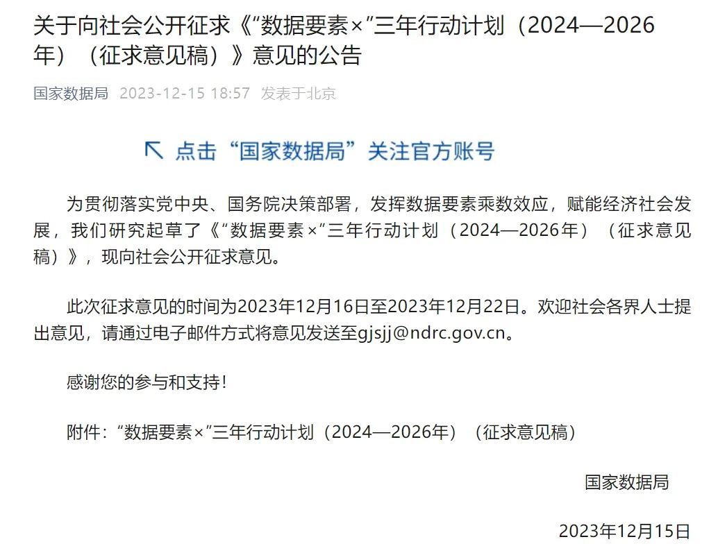 12月15日,国家数据局发布了关于《“数据要素×”三年行动计划(2024—2026年)(征求意见稿)》(以下简称“三年行动计划”)公开征求意见的公告。这是首个针对数据要素领域,跨行业、跨领域,旨在激活数据要素“乘数效应”的行动计划。其核心目标旨在通过推动数据资源的开放共享和交易流通,以及支持各类经营主体强化数据开发利用,来培育具有中国特色的数据产品和品牌。