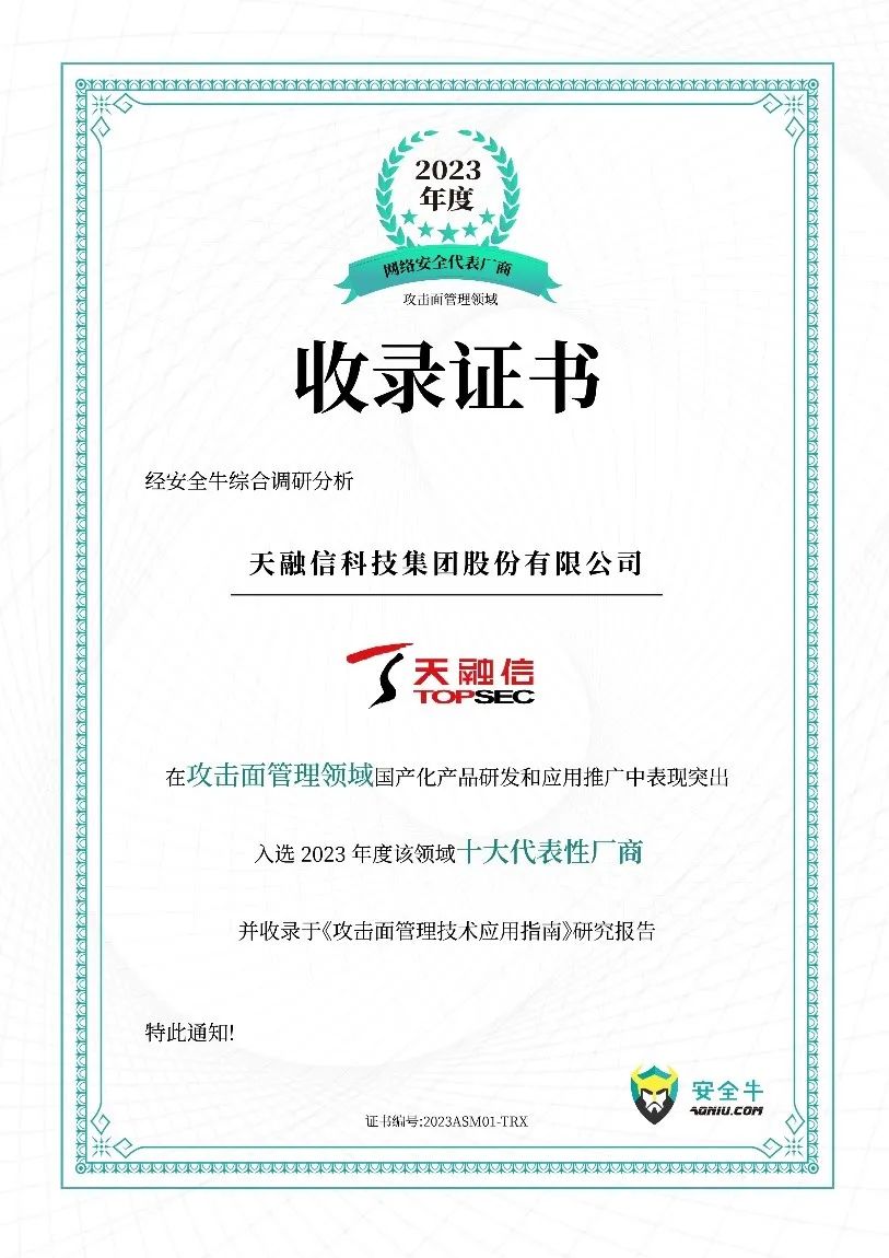 安全牛发布《攻击面管理技术应用指南》报告,天融信入选2023年度攻击面管理领域十大代表性厂商。