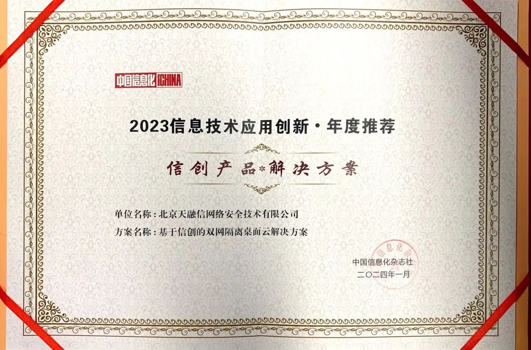 近日,由电子工业出版社华信研究院主办,《中国信息化》杂志社等承办的第三届信息技术应用创新发展论坛成功召开。会上,《中国信息化》杂志社公布了“2023信息技术应用创新·年度推荐”入选名单,天融信凭借《基于信创的双网隔离桌面云解决方案》成功入选。该活动自2021年发起,天融信已连续三届获评。