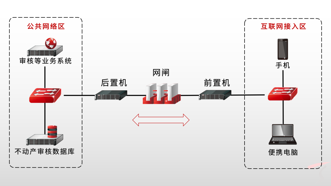 在公共网络区和互联网接入区之间部署天融信安全数据交换系统(前后置机)+网闸,阻断基于TCP/IP协议的各类攻击。前后置服务器将应用数据剥离出来,使用专用的私有协议封装,通过网闸将数据摆渡到对端,完成不同安全等级网络之间的数据安全交换,满足了互联网接入区用户、外部单位、上下级部门安全访问不动产审核数据库、业务系统数据,实现自然资源单位的审核、登簿、缮证等环节业务。