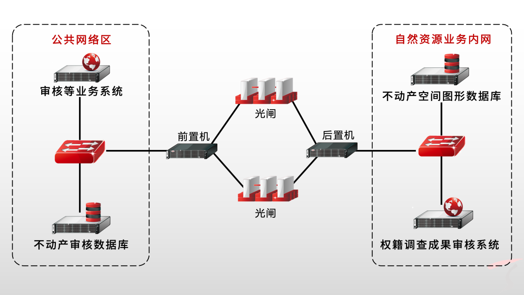 在公共网络区与自然资源业务内网之间部署天融信安全数据交换系统(前后置机)+光闸,利用光信号的单向传输原理,实现应用协议数据的单向交换。使用两台光闸的部署方式,可有效避免公共网络区与自然资源业务内网区之间,数据交互所导致的数据泄露、数据被截取等安全风险,实现自然资源业务内网对公共网络区数据的审核、不动产审核数据的调用,跨地区、跨部门、跨层级网络互联和信息互通共享。
