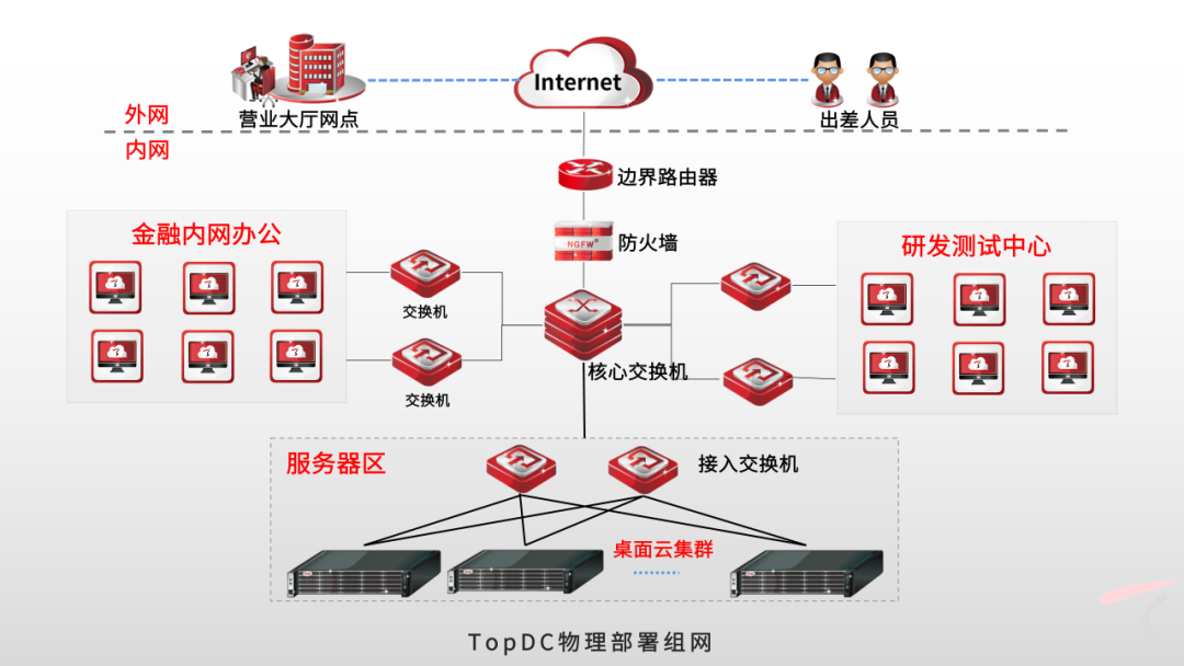 天融信深耕云计算领域,为解决金融行业办公终端问题,推出金融行业桌面云解决方案,采用业界主流的VDI+VOI融合桌面云架构,全面兼容国产主流芯片和操作系统,满足信创终端建设需求,实现桌面简易化系统管理、资源共享、权限集中管理、数据安全可靠等功能,有效提高资源利用率以及数据的安全性。