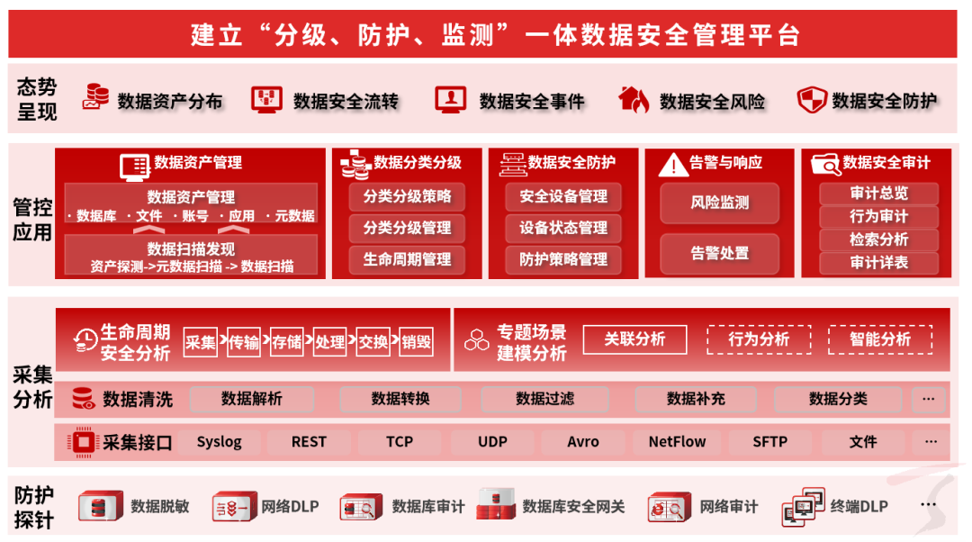 天融信数据安全管理平台以数据安全治理为基础,数据安全防护为手段,数据安全生命周期为管理核心,数据安全服务为支撑,基于以数据为中心的安全架构,利用大数据、机器学习技术,对数据安全信息进行采集与分析,实现数据资产全面识别与统一管理、快速定级与备案管理、组件备案与精准防护、风险发现与监测告警,实现全面合规、协同智能、统一集中的数据安全管控。