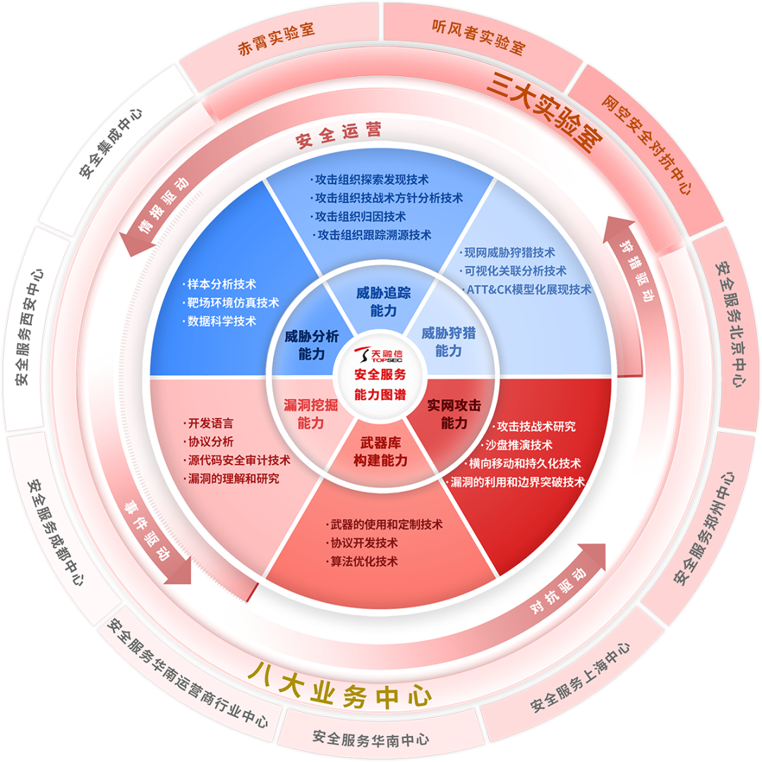 天融信安全服务团队由“八大业务中心+三大实验室”组成,共1000+名专业安全服务人员,结合天融信覆盖全国的90余个分支机构,为客户提供优质的安全服务。同时,天融信具有完备的安全服务体系,通过咨询保障、红蓝对抗、安全运营、新技术测试、行业专项、安全集成6大类专业安全服务,覆盖攻防演练、安全运营、商用密码评估、关基安全、数据安全、工控安全等40余个典型场景,为全国各行业客户提供长效的安全支撑。