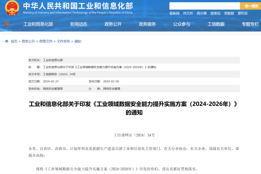 近日,工信部印发《工业领域数据安全能力提升实施方案(2024-2026年)》(以下简称《实施方案》),提出到2026年底,我国工业领域数据安全保障体系基本建立。数据安全保护意识普遍提高,重点企业数据安全主体责任落实到位,重点场景数据保护水平大幅提升,重大风险得到有效防控。数据安全政策标准、工作机制、监管队伍和技术手段更加健全。数据安全技术、产品、服务和人才等产业支撑能力稳步提升。