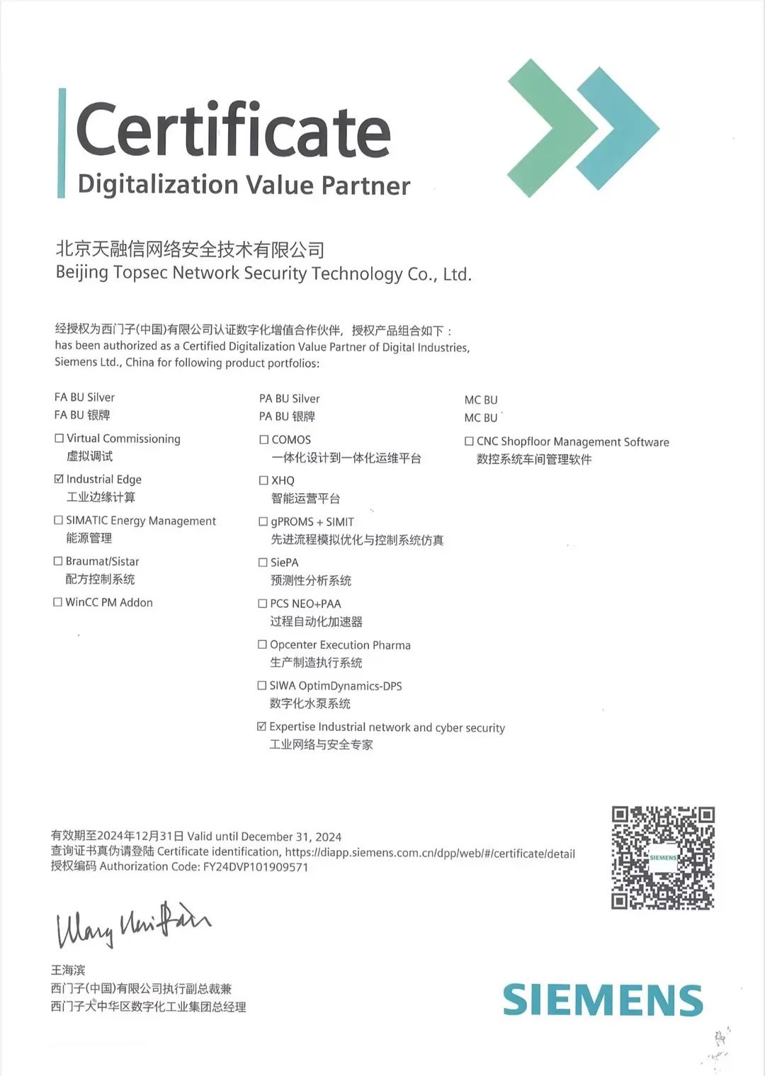 近日,天融信与西门子签订合作协议,正式成为西门子(中国)有限公司数字化增值合作伙伴(Digitalization Value Partner,简称“DVP”),并取得其“工业网络与安全专家”和“工业边缘计算”组合授权,是首家获得西门子DVP认证的网络安全厂商。