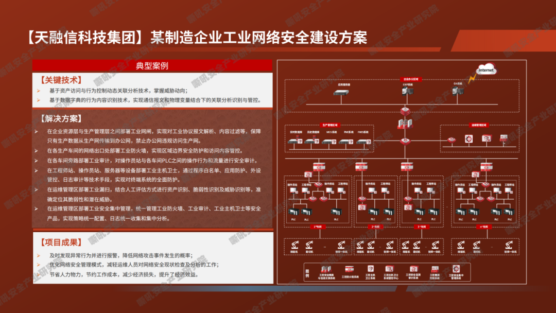 天融信不断深入探索工业业务场景的特殊需求、深研工业通信协议的特性以及强化信息安全技术,并在工业技术国产化进程、关键信息基础设施安全防护体系建设等方面持续发力,保障国家信息安全的自主可控。同时,天融信也在工业数据安全领域深入研究,为工业互联网环境下的数据保护提供了坚实的技术支撑,帮助企业提升数据安全管理水平,防范潜在安全风险。天融信现已推出5大类14款安全产品,并已在电力、石油、制造、水利等35个行业80+业务场景广泛落地实践,为推进新型工业化提供强劲动能。