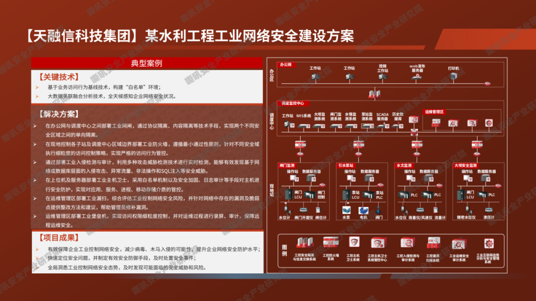 近日,由嘶吼安全产业研究院编撰的《鉴于止水·无行地难:工控安全行业应用专题报告 2024》(以下简称为“报告”)正式发布。天融信作为具有工控安全业务的上市网络安全综合企业典型代表,本次有6大类20项细分领域入选工控安全产业图谱,同时获制造、电力、能源、市政、轨交五大行业推荐,其中制造、电力行业典型案例入编报告。