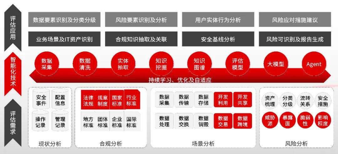 ◆在动态数据安全评估中,提出时序分析模型、异常检测模型和关联分析等技术逻辑。强调数据识别模型在数据安全评估实施中的核心作用,以及业务应用中操作信息、人、主体、客体、数据、程序和环境的重要性,并提出AI智能体、算法、基础技术和支撑设施在数据安全评估中的应用。