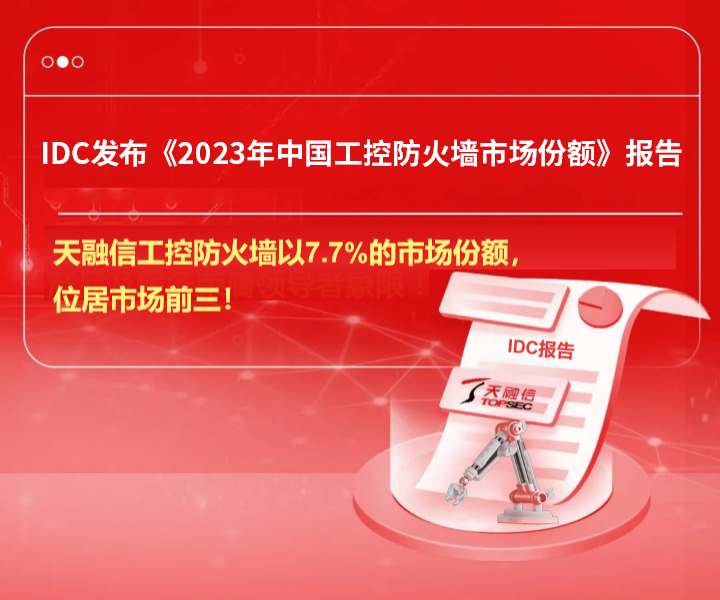 近日,国际权威机构IDC发布《IDC MarketShare:中国工控防火墙市场份额,2023:逆势上扬,市场实现超20%的高速增长》报告(以下简称“报告”),天融信以7.7%的市场份额,位居中国工控防火墙市场前三。