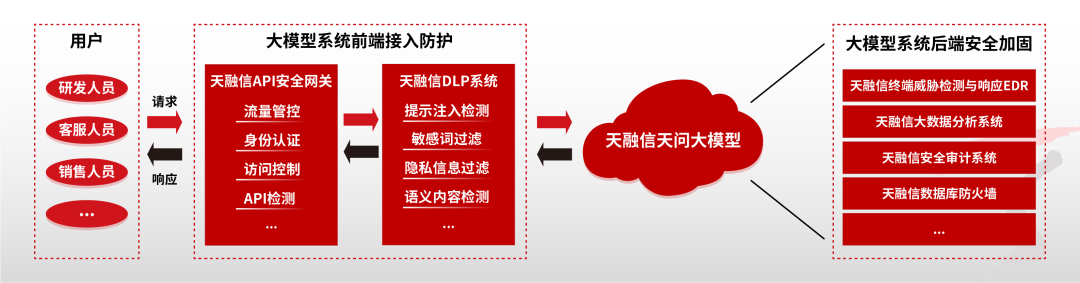 天融信天问大模型支持云端部署,并以云服务方式提供外部使用,为了防止模型被滥用或恶意利用,天融信提出了前后端联合的安全防护方案,整体防护架构如下: