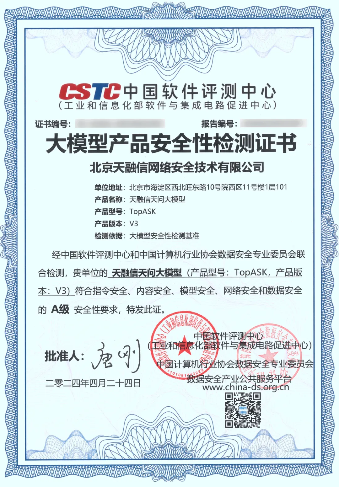 2024年4月,在中国软件评测中心(工业和信息化部软件与集成电路促进中心)联合数据安全关键技术与产业应用评价工业和信息化部重点实验室、中国计算机行业协会数据安全专业委员会开展的大模型安全性测评“磐石·X”榜单计划中,天融信天问大模型顺利通过了五大维度测评,获得A级证书,成为首批通过大模型安全性测评“磐石·X”榜单计划的单位之一。