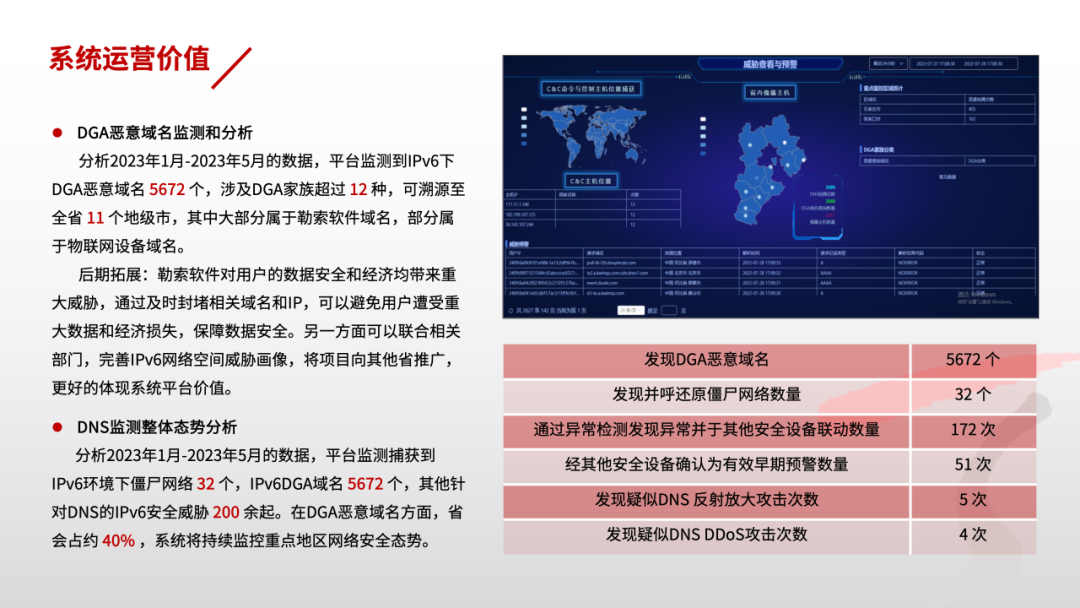 天融信天问大模型的DGA恶意域名检测智慧引擎在某运营商试点项目中运用,监测到IPv6下DGA恶意域名5672个,涉及DGA家族超过12种,监测捕获到IPv6环境下僵尸网络32个,预计每年能带来2144万元的经济效益。对IPv6 DNS日志进行基于人工智能神经网络技术的检测分析,填补了维护IPv6 DNS服务安全的空白,有效地遏制了IPv6环境下网络安全风险的蔓延,有力地防范了新互联网环境下的未知风险。