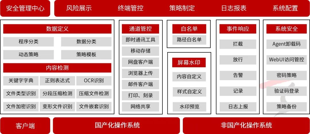 方案全面适配麒麟、UOS等国产操作系统,实现国产化与非国产化架构环境下数据防泄漏系统功能一致性,并支持管控中心对国产化和非国产化客户端的统一管理,实现统一日志收集分析以及安全策略下发等功能。